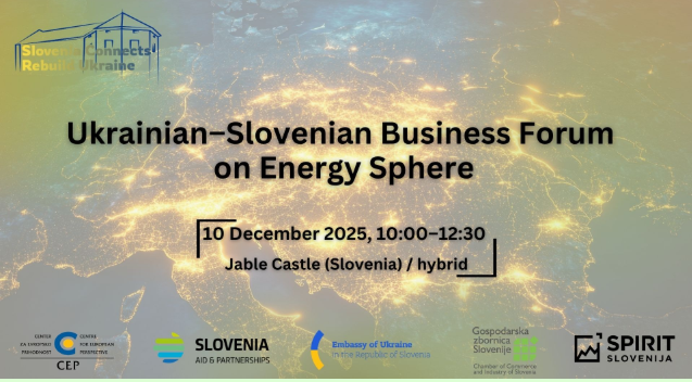 V partnerstvu s Centrom za evropsko prihodnost (CEP), Veleposlaništvom Ukrajine v Sloveniji in Javno agencijo SPIRIT Slovenija vas vabimo poslovni forum, namenjen vzpostavljanju konkretnih partnerskih priložnosti med ukrajinskim in slovenskim energetskim sektorjem.