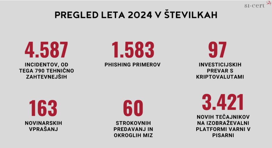 Nacionalni odzivni center za kibernetsko varnost SI-CERT je pripravil pregled ključnih statistik iz področja kibernetske varnosti v letu 2024. Tudi tokrat je poročilo razširjeno s podatki slovenske policije o številu in vrstah obravnavanih spletnih goljufij, da ponudi čim celovitejši pregled. Obravnavanih je bilo 4.587 kibernetskih incidentov, kar predstavlja 7-odstoten porast glede na 2023. Ponovno tako po številu kot višini oškodovanj izstopajo kripto investicijske prevare. Kot v preteklih letih, se ponovno nadaljuje trend preusmerjanja napadalcev na naše mobilne naprave (izvabljanje podatkov pod krinko lažnih SMS-sporočil, zlonamerne aplikacije, namenjene zlorabi mobilnih bank ipd.)