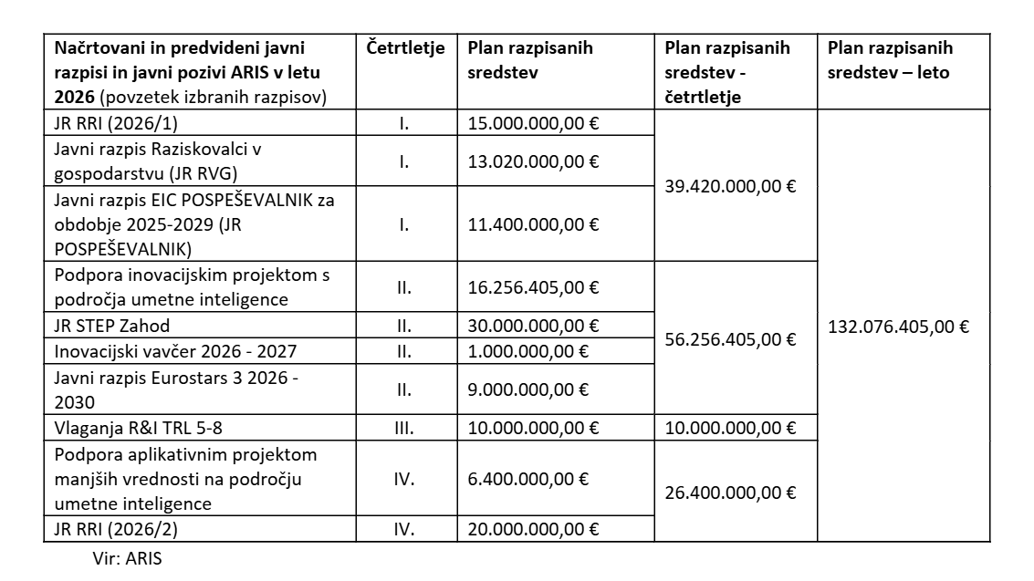Agencija ARIS je objavila pregled načrtovanih in predvidenih javnih razpisov ter javnih pozivov za leto 2026. Med njimi je več ukrepov, ki so lahko relevantni za IKT podjetja, zlasti na področjih raziskav in razvoja, umetne inteligence, inovacij.