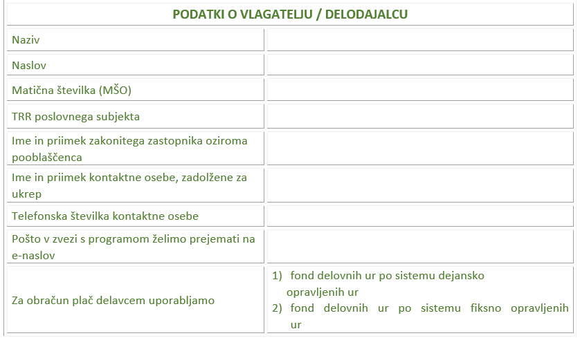 - V prilogah so priložena tudi celotna navodila za oddajo vloge in tudi tabela, v katero se vnese seznam delavcev, ki bodo vključeni v ta ukrep.